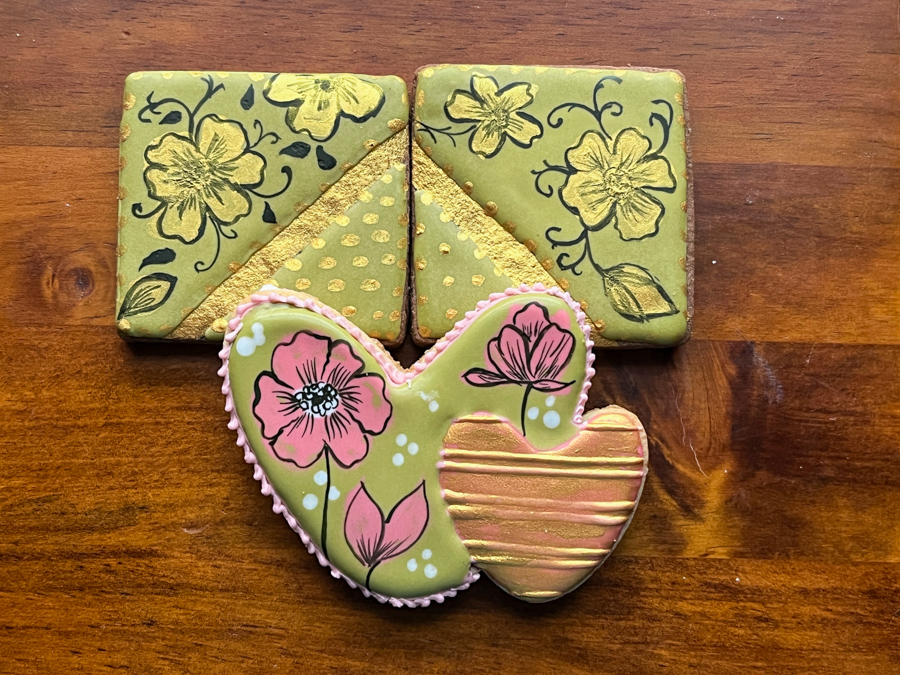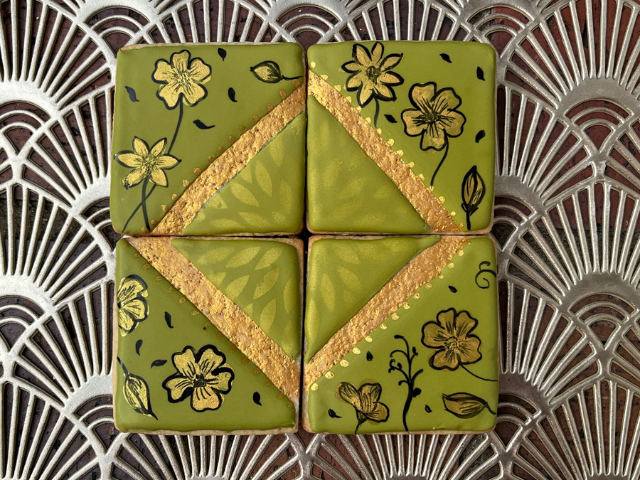 Below a few steps of the prep for these cookies… First, painting with gold, icing with green, and using a stencil to add a pattern just in one area of the cookie. Luster gold to paint a very loose design of the flowers, and the black details added once it all dries, which is less than 10 minutes.