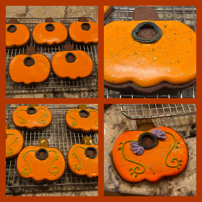 The background of the pumpkin is made a little more special by spray painting the edges and then splashing some gold on the whole surface. I love that technique, which she demonstrates very well in the video. Just adding these two additional steps to the background makes the cookie special. But, of course, the icing on the cake is the sunflower, petals piped over a ring of icing to give it a little more lift. With Marlyn, it is all in the small details. Below, you can see some of the steps in the preparation of the cookies.