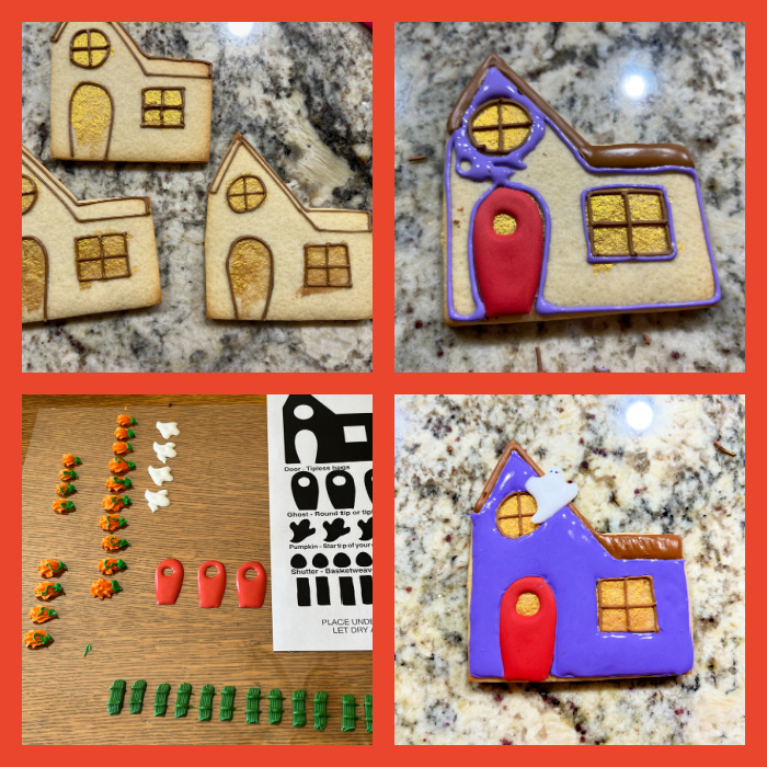 I cut the cookie by hand using the template she provided, but you can easily adapt the features to any house-shaped cookie cutter you own. Some of the steps involved are shown in the composite picture below.