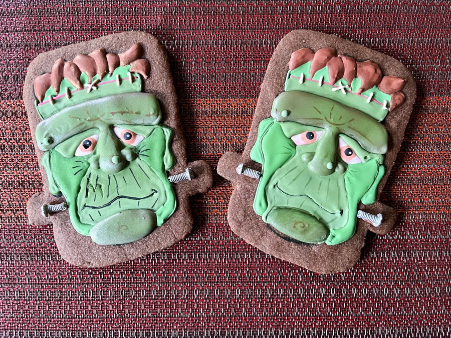 Once again, I was not sure I could go through this little marathon of cookie decorating, but it seemed like too much fun to pass. Through her Patreon site, Marlyn provides the stencil (svg file) to facilitate piping on the cookie, and all templates for the Royal icing transfers (nose + eyebrows and chin). Still it was a bit intimidating. I started with three large cookies but one of them had a very sad death when Sally lost her temper. Enough said. He was going to be too ugly even for Viktor Frankenstein’s standards. Obviously, I cannot go through every single detail, as this is a paid tutorial from Marlyn, but the composite picture gives you an idea of what is involved: making the transfers, piping each section (including the eyes), and assembling everything. The screws are molded fondant painted with silver dust.