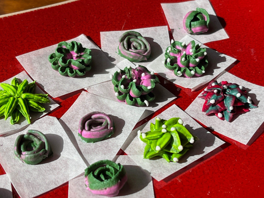 Once the basic components were baked, I started decorating. A couple of weeks ago I took an online class with Haniela where she taught us how to pipe succulents using Royal icing, and I made a bunch during class, and decided to incorporate them in my cookie scene.