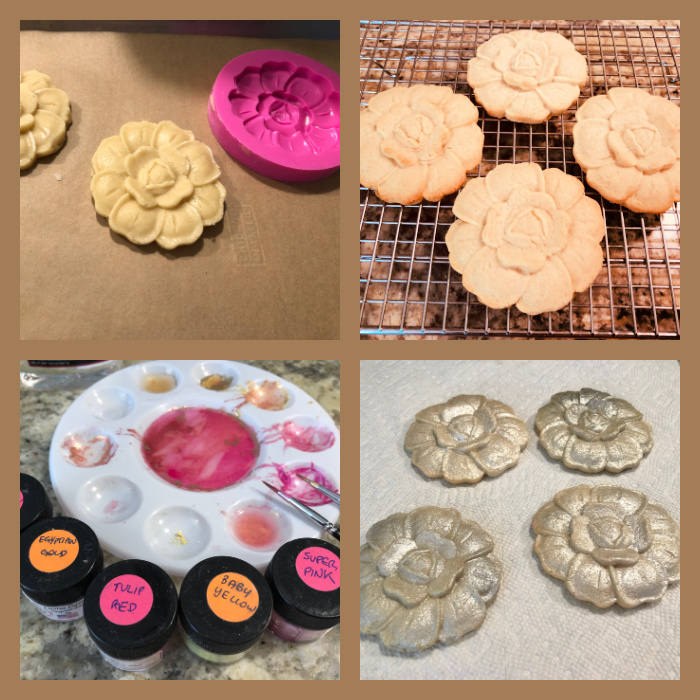 For these cookies, I used this mold. Once they were baked, I sprayed the surface with PME pearl spray and then went over the details with luster powder mixed with vodka.