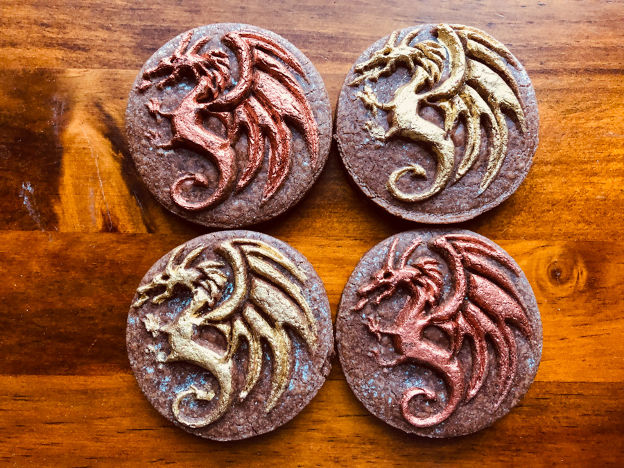 Stamp used can be found here. One of my favorites for sure. I just love the Game of Throne-ish look of this pattern. I do believe this one shines with a little gold or copper, but if you don’t have that available, no major harm done. Chocolate is a must, or any cookie dough that is dark and won’t expand during baking.