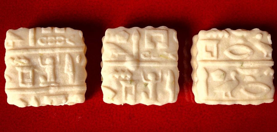 This cute rolling pin is available here. In this batch I used lime and a touch of coconut, but they puffed a little more than usual, so the design was not as sharp. They were made into sandwich cookies with a lemon buttercream as filling.