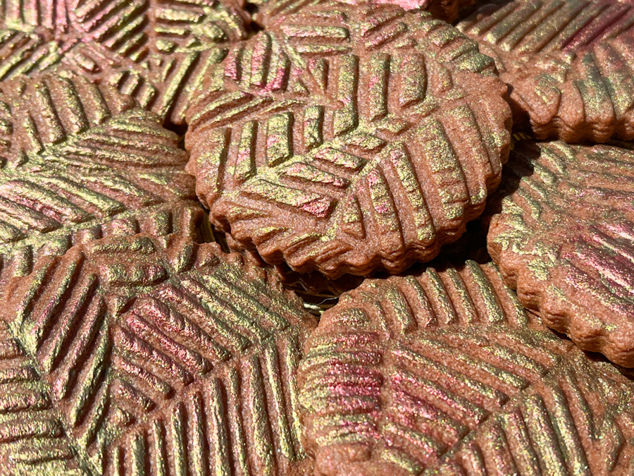 The rolling pin used is from this etsy store. I have used this pattern countless times, it looks great without any adornment, but I liked the mixture of copper and red that I used in this batch. It is just luster powder diluted with vodka and applied with a brush.