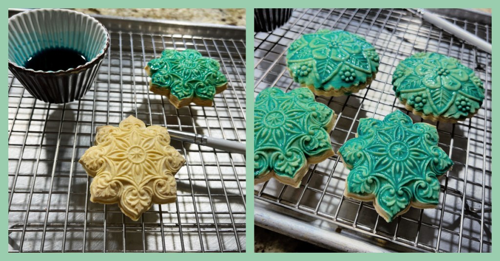 In this batch, the new technique was glazing instead of painting. I used this method to make the green-teal cookies shown below.