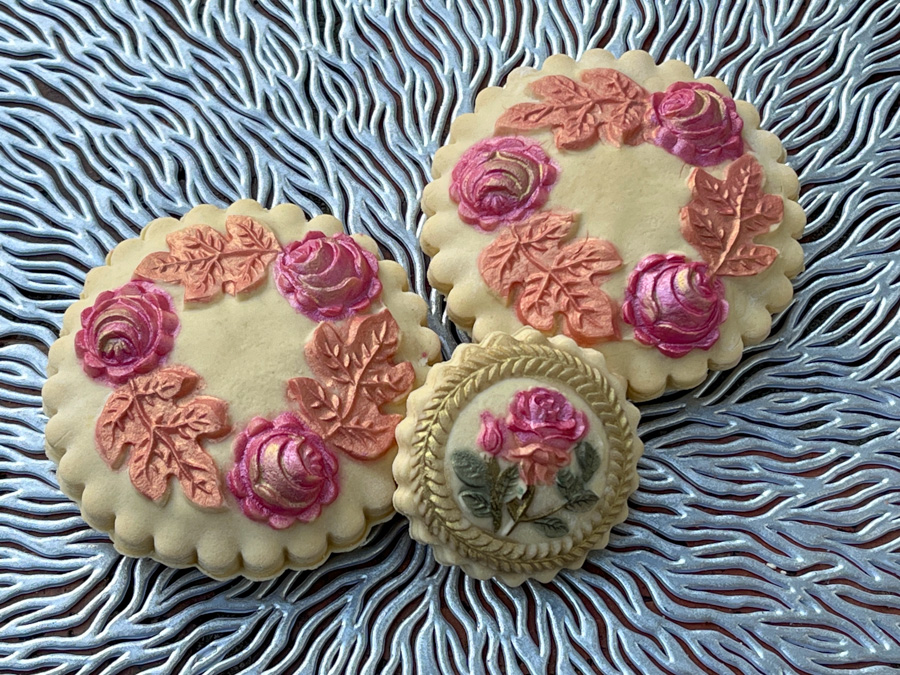All other biscuits from this batch were painted as I have shown in the video, with luster powder mixed with vodka. I’ve had these flower molds for many years, and I never get tired of using them.
