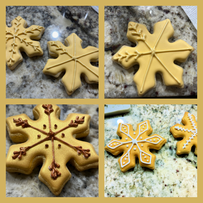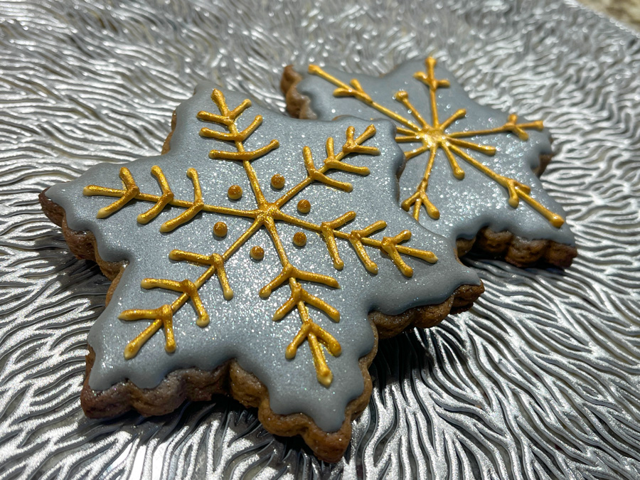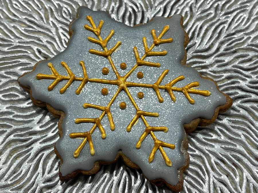 Once again, the task for the month of December was very simply stated: use metallics to decorate your cookies. There are two ways to do it, you can air-brush or spray paint using products available from Wilton (such as this one) or from PME (such as this one). When you consider how fast the spray painting can go, it is a super efficient way to decorate many cookies at the same time. Of course, if you are going to gild the lily with extra piping or sprinkles, that will add a bit more time and effort, but in my opinion it is totally worth it.