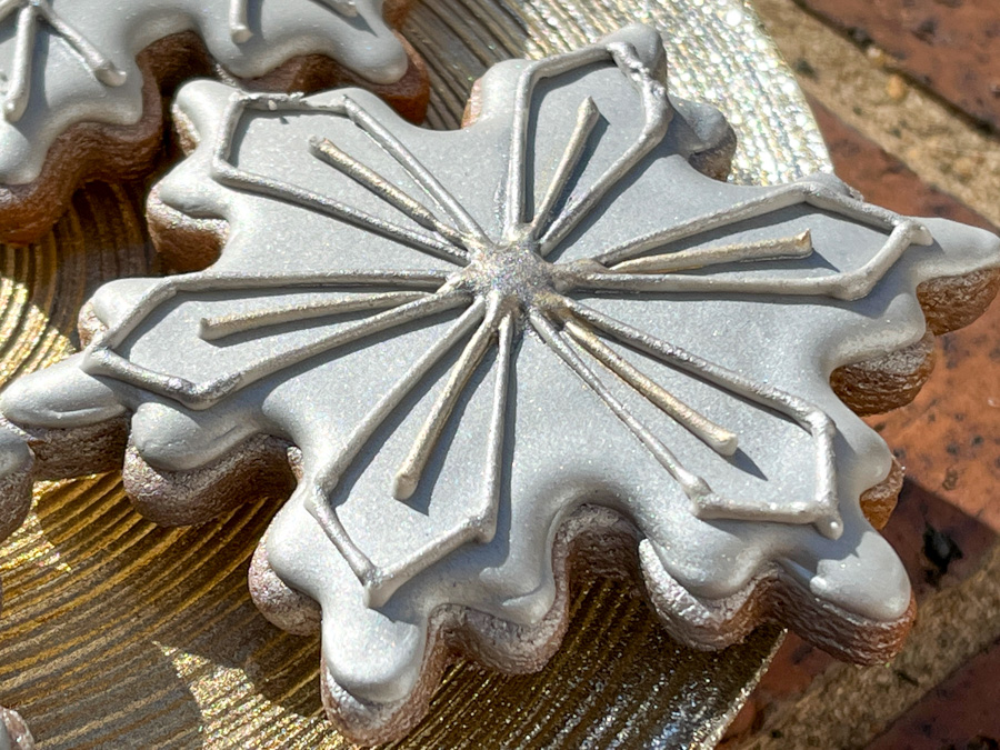 For all the designs I used flooding either with Americolor Gold (to spray gold later) or Americolor Gun Metal (to spray silver). Once that base is set, I added details in piping consistency using either a similar color or white. That then gets painted with luster powder. If you start from white flooding, the metallic effect will be less pronounced, and the final color a bit more faded.