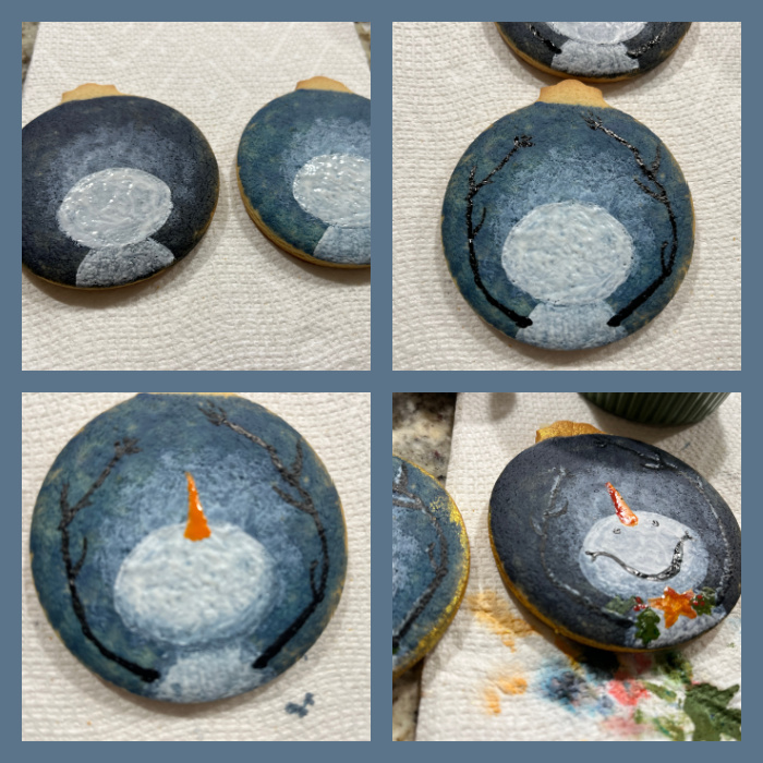 Below you see some of the steps in the painting process, that happened on a naked cookie, no Royal icing at all… Michelle uses little guiding dots to space the different portions of the design, so that everything ends up with perfect proportion in the end. Even to paint the star, she had a cute method so that the points would end up exactly where they are supposed to. We started making a blue background darker in the edges and lighter in the center, and then slowly painted all the components on top.