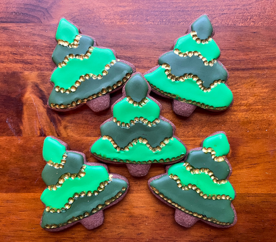All the cookies get flooded with green. Two of them were allowed to set overnight, or for at least 6 hours. The other two had the surface textured once the icing starts to crust. It is hard to tell exactly how long to wait, as it will depend on the consistency of your icing, the humidity of the environment, and of course the recipe of icing you use. But you can wait for 30 minutes and try one spot, see how it behaves You want the icing to give in but not crack. The second design was air-brushed in gold using a stencil. All of them got the same decoration, a little fondant painted with food gel + vodka.