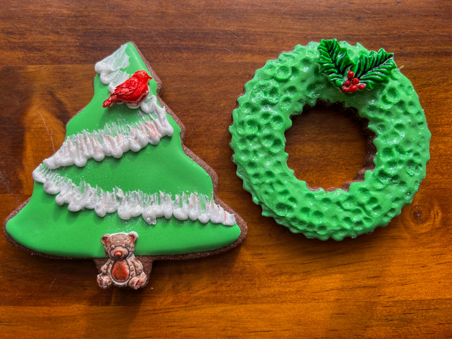 With this post, I will finally close the chapter on Christmas designs… Last year I made wreath designs using the appropriate cookie cutters, this time I decided to improvise and use two round cookie cutters instead. Scalloped edges give a touch of elegance, although I admit, icing that is a little more tedious. I used two different methods to decorate – adding texture with a fondant baller, or adding a delicate pattern with stencil and air-brush. I honestly do not now which one I prefer, so you decide!