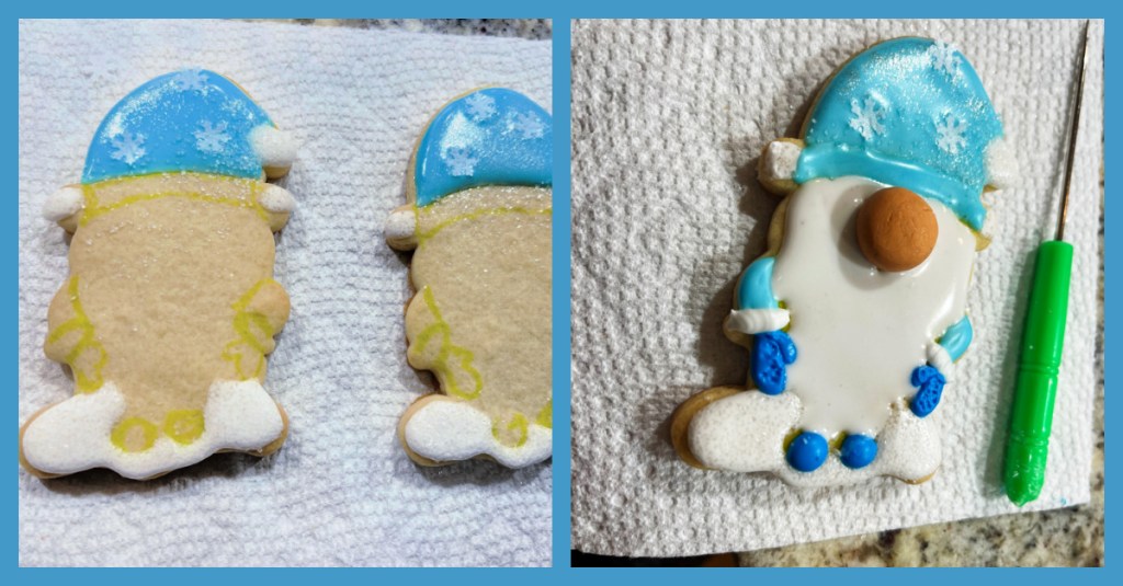 I love when cookies make me smile, and these gnomes do it, big time! So many details… First, you need to make the nose with fondant or modeling chocolate, once that is ready you can start piping the different sections and adding all the bells and whistles.
