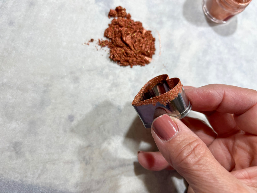 Once the shells are piped, wait for them to crust. Then, choose the shape and size of cutter you want for the design. Since macarons are so small, you’ll need cutters that are normally used for fondant. Dip the cutter in luster powder (I used copper color), and press it on the surface of the shells, right before sticking them in the oven.