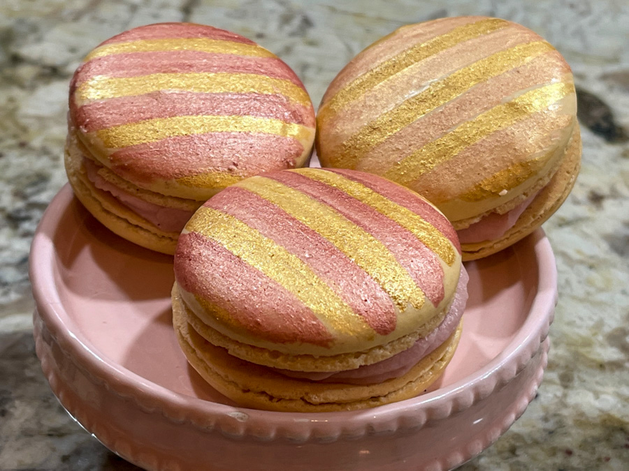 Today I share a new way to decorate macarons, something a friend saw on TikTok (click here), urged me to try, and I did not think twice! The concept of adding textural design to the shell is not new, in fact I’ve made many batches using a fondant baller tool to add a pattern to the surface (check one of my first versions clicking here). All you need to do is wait for the shell to crust, then work your magic. Today’s version uses a small heart-shaped cookie cutter dipped in luster powder to imprint a little heart on the shells. Depending on how hard you press the cutter, you can get a nice lift on the design. I used the French meringue method, and filled these macs with raspberry buttercream.