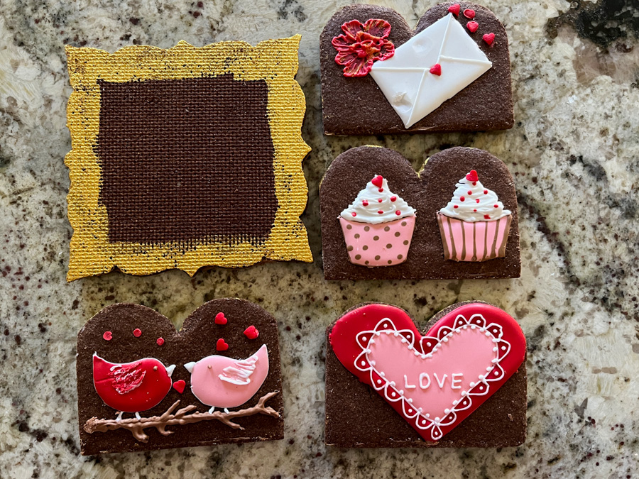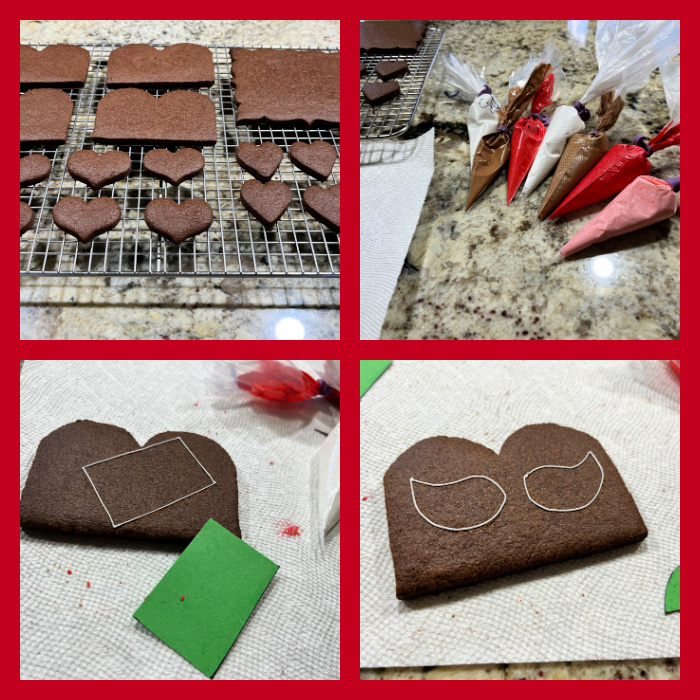 Tunde provided all the templates to cut the cookies by hand, and the base was made with a large cookie cutter, which I happened to have in my basement. She also provided the little templates to pipe the designs: envelope, birds, and cupcakes. Not many colors were needed, pink, red, white, and light brown, all in small amounts, as the cookies are not fully iced. Some colors are needed in piping and flooding consistencies.