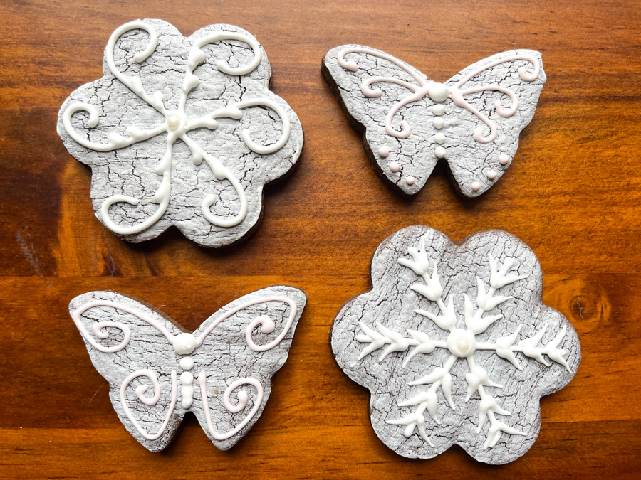 The whole idea is to use AMERICOLOR WHITE to paint the dough before baking. I bake my cookies from frozen, so I paint them right after cutting, and then freeze. I had one additional design attempted – brush embroidery over the crackled base. That did to go well, maybe it explains why I have never seen it around…