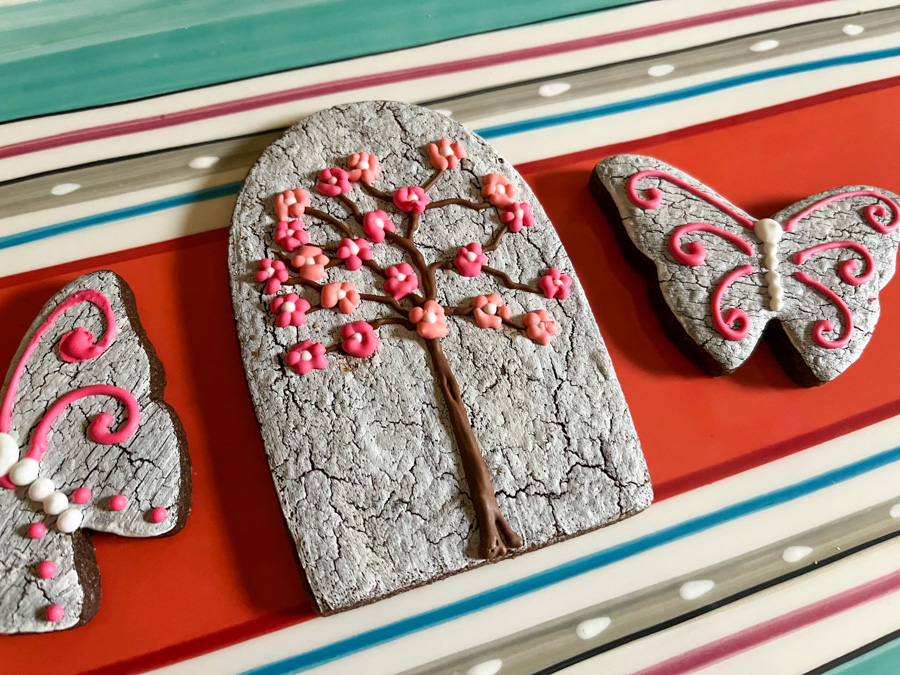 Crackled base is another method to decorate that minimizes icing, and it is so easy. In theory, cookie dough with more leavening agent will originate a more dramatic look. My chocolate dough has no leavening at all, so the effect is subtle. Your kitchen, your rules!