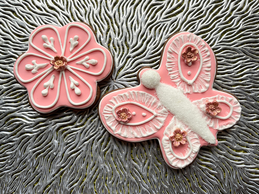 What a sweet, elegant cookie Tunde designed here! You make it in stages, the center part gets flooded and covered with sanding sugar first. Then the flooding on the adjacent area, once that sets, the details are incorporated. Tunde piped the roses with Royal icing in her tutorial, I went with fondant, and piped only the leaves. I just love this cookie so much!