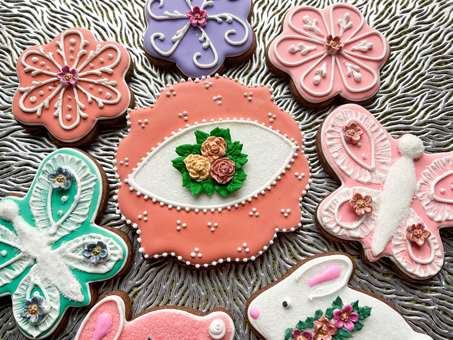 How cute are those bunnies? You tell me! Very simple to decorate, flood, cover with sanding sugar and add the details. Once again I used fondant flowers and piped the leaves with icing. I had the eyes from a project last year, and put them to use for these babies, as Royal icing transfers. It’s always a good idea to save leftover transfers, you never know when they can come in handy.