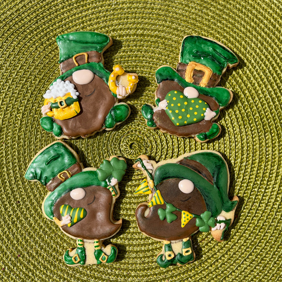 There they are, four little guys, one pretty happy with his huge beer… Judging by his smile, it was not his first! The cookies have many details that make them shine. Below I go through some of the steps to make them, all very well-explained in her video tutorials. It all starts with making the transfers and allowing them to set overnight. The basic design is added to each cookie (I used a mini-projector for that), and icing in 5 colors is prepared, each in the correct consistency for the job. Shirlyn uses a single consistency for piping and flooding, and that is the way to get more lift on the icing, but it requires quite a bit of skill to ensure a smooth surface. My icing was perhaps a little too thick in some cases.