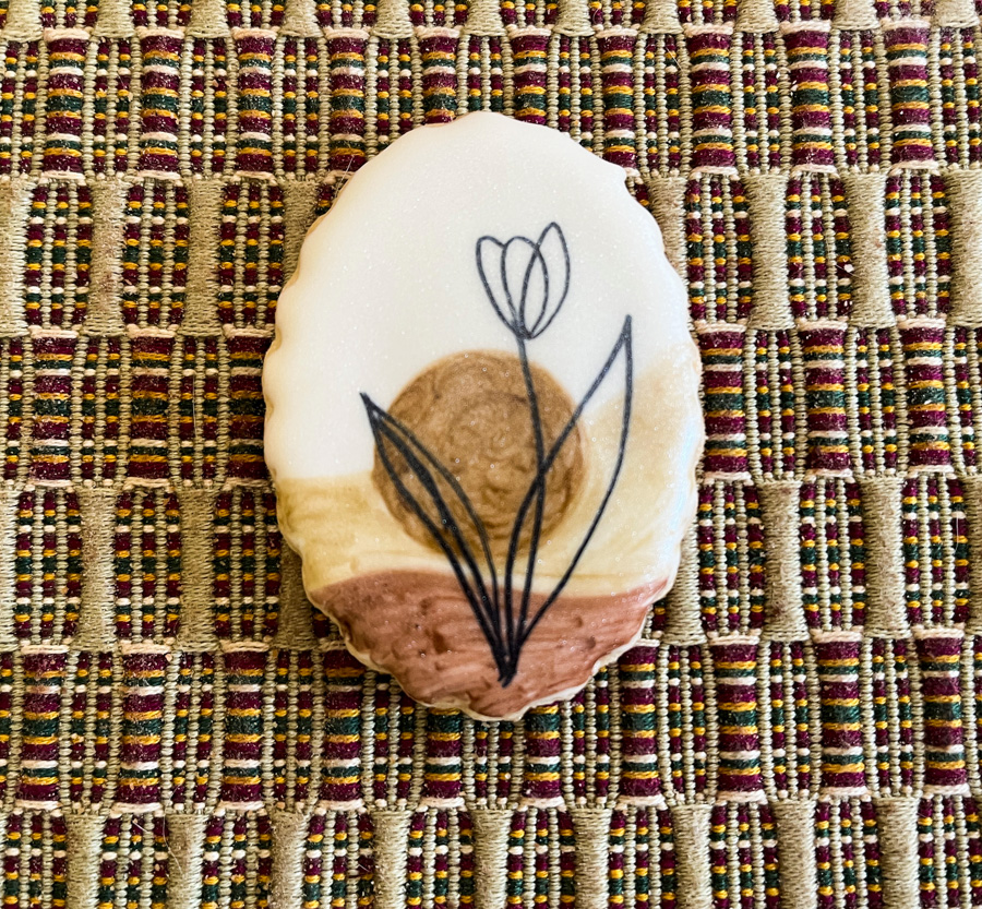 Going for a modern take on flowers. The outline was done first, using a single line, so I started at the bottom, went up drawing the leaves, and all the way up to the petals, without lifting the pen. I used to doodle this type of shapes a lot when I was a teenager, so why not put it to use in cookies, right? Once the pen lines dried, I used a food safe pen to paint.