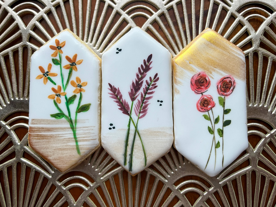 Royal ice in white. Painted with Sugarprism (click here for the product) using watercolor techniques. I sat down with some youtube videos showing how to paint simple flowers, and went to work. A brush accent with gold because I cannot help it.