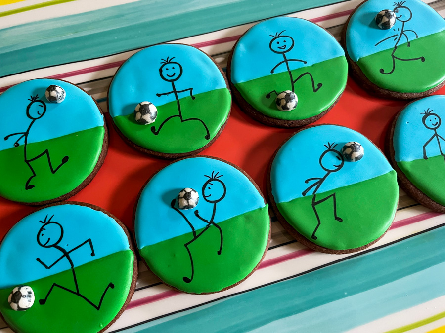 The cookies are super easy to make. Just flood in two colors for lawn and sky. Let it fully set. Use a pen to draw stick figures. Lots of inspiration online, just google stick figures soccer player… Make a fondant ball, let it dry and go with a pen to paint the details. One pentagon in the top, a few around it, then lines connecting the corners.
