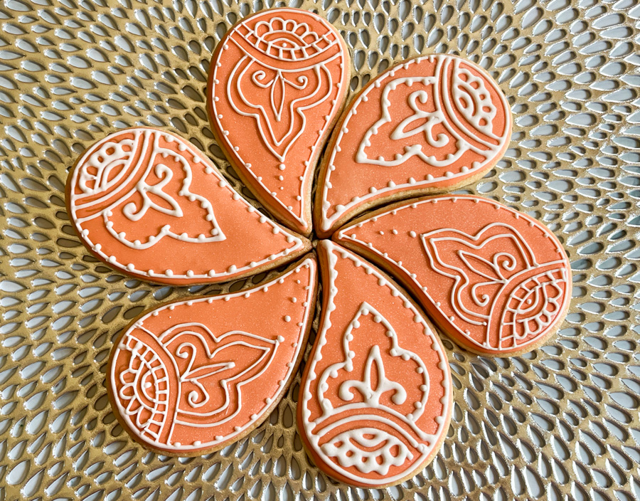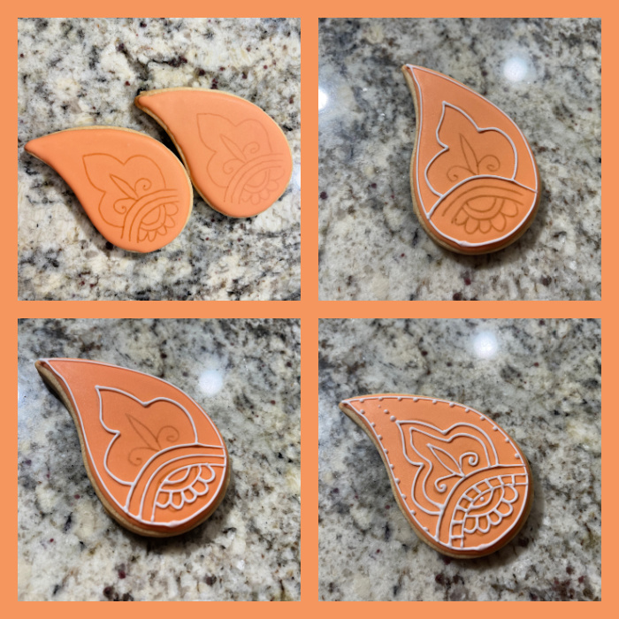 For the following adventure, I chose a pastel color (very small amount of Sugarflair PAPRIKA color), and then used a mini-projector to draw the image on the paisley shaped cookie.