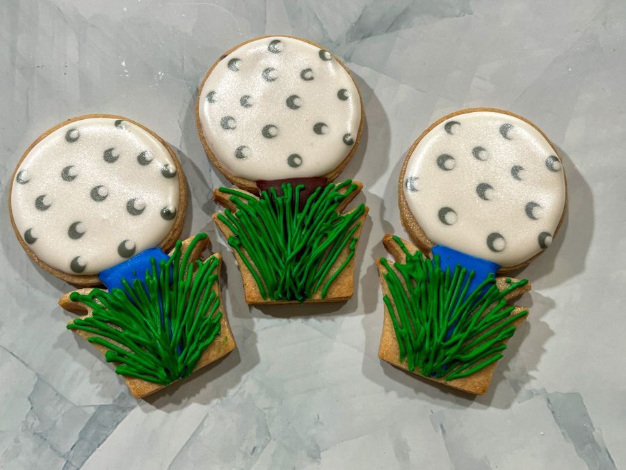 To make the effect of the golf ball, I used gray on white icing, wet on wet. First the gray dots are piped and immediately after a little white icing is added off center to give the shaded effect. The grass was added once the full icing was set, using thick consistency green and a tipless bag.