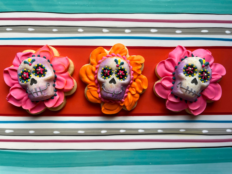 Dia de los Muertos is huge in Mexico and contrary to what happens in Brazil (we celebrate on the same day), in Mexico the festivities have a happy atmosphere. Colors, lots of colors are always present, and funny stories are shared about those family members who are not with us any longer. It is more a celebration than mourning. Today I share two styles of cookies made by two of my favorite cookie artists. They are intermediate to advanced in technique, simply because you’ll need to master those fine lines…..