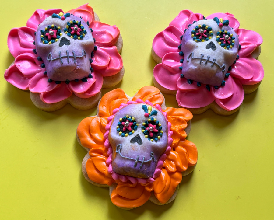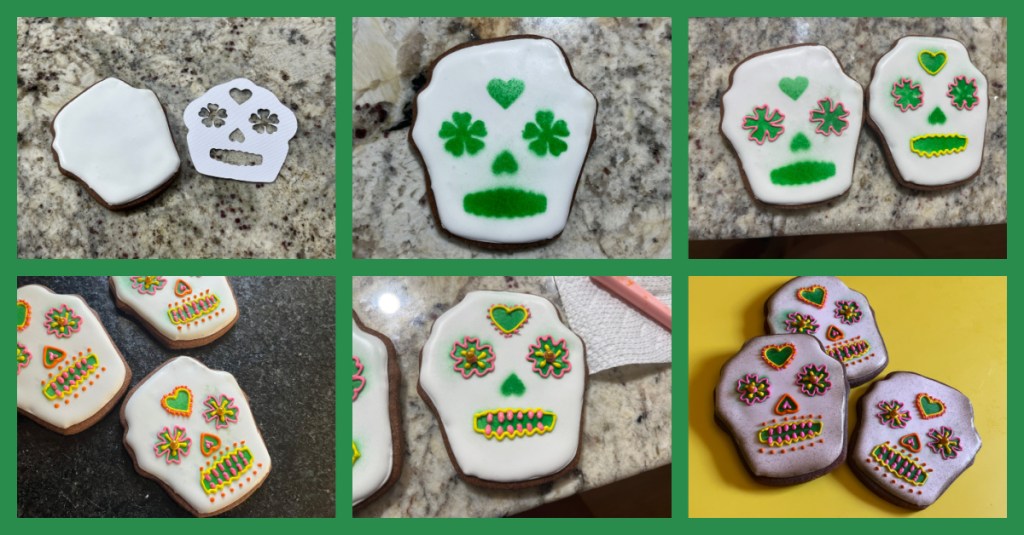 You will need to bake two separate cookies to make these adorable/scary flowers. I used this mold to get the skulls, froze the cookie dough in the mold for 10 minutes, un-molded ad baked from frozen. Then the skull is iced with very thin white Royal icing, and air-brushed with two colors, I used purple and yellow. Once that sets, the fine lines are added. The whole tutorial is available if you are a member of Marlyn’s Patreon site (click here to join). Below some of the steps involved.