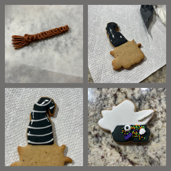 So many details to make this set! My favorite step was making the broom as a Royal icing transfer. The spider on the top of his hat is also a transfer. Some of the steps are shown in the composite picture below.