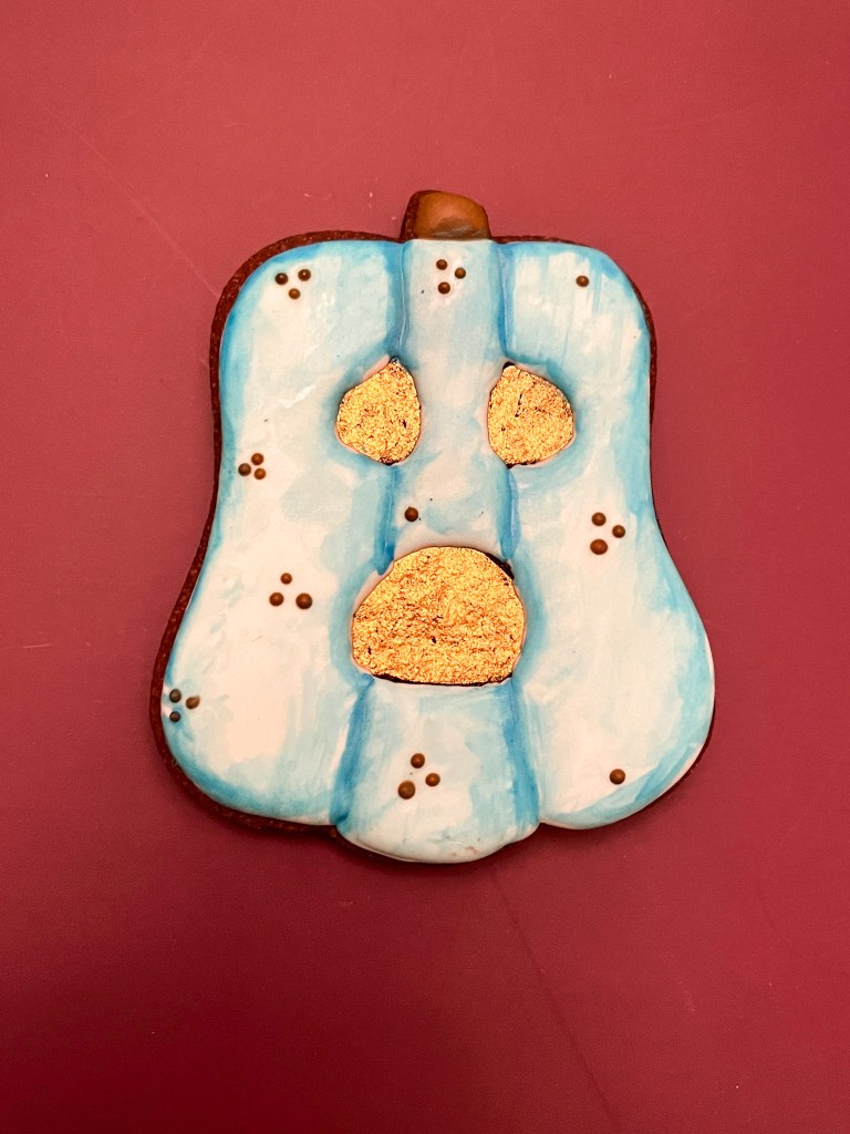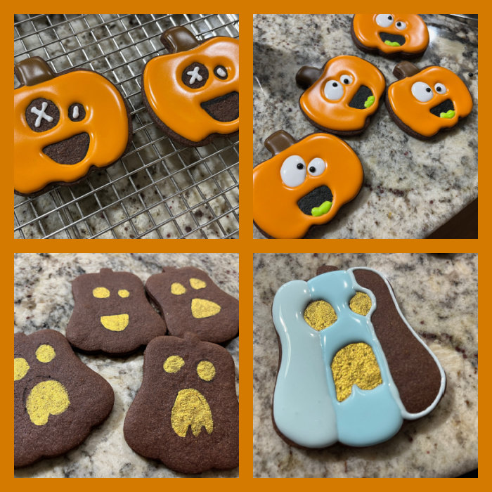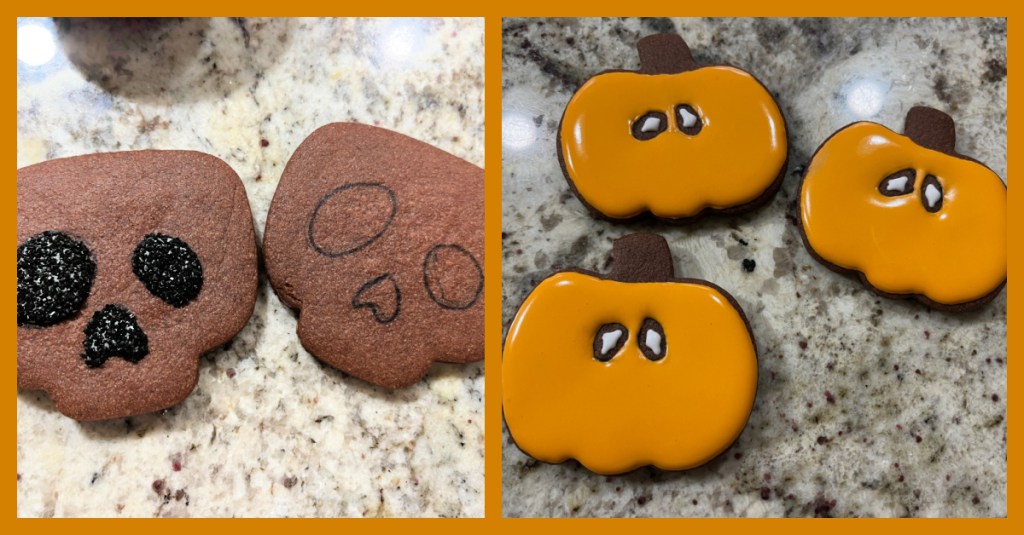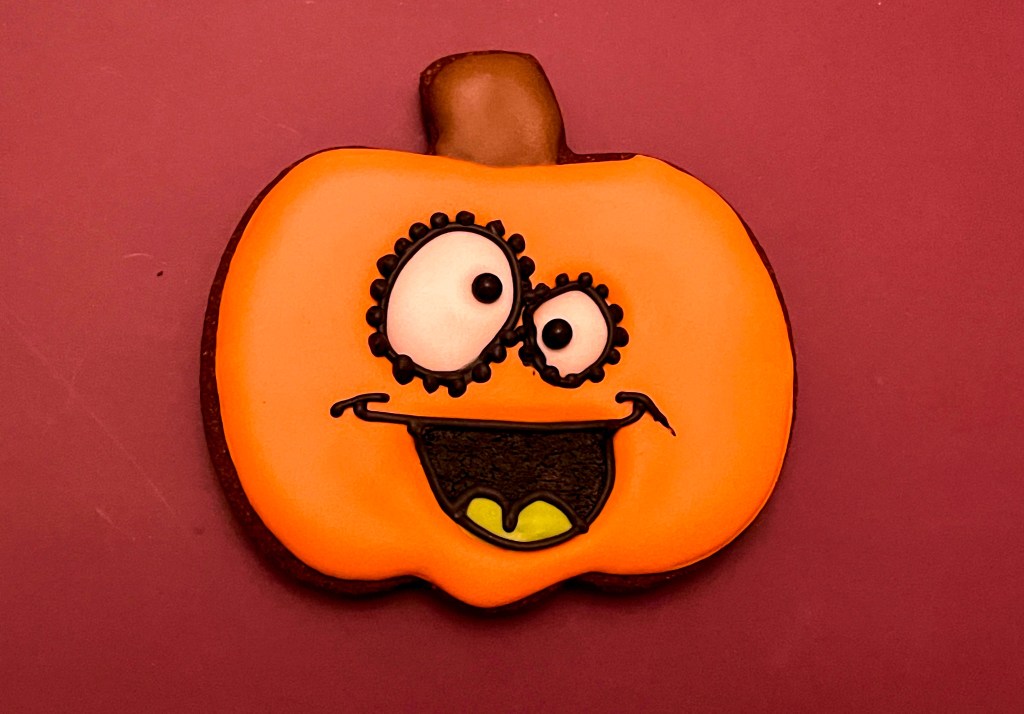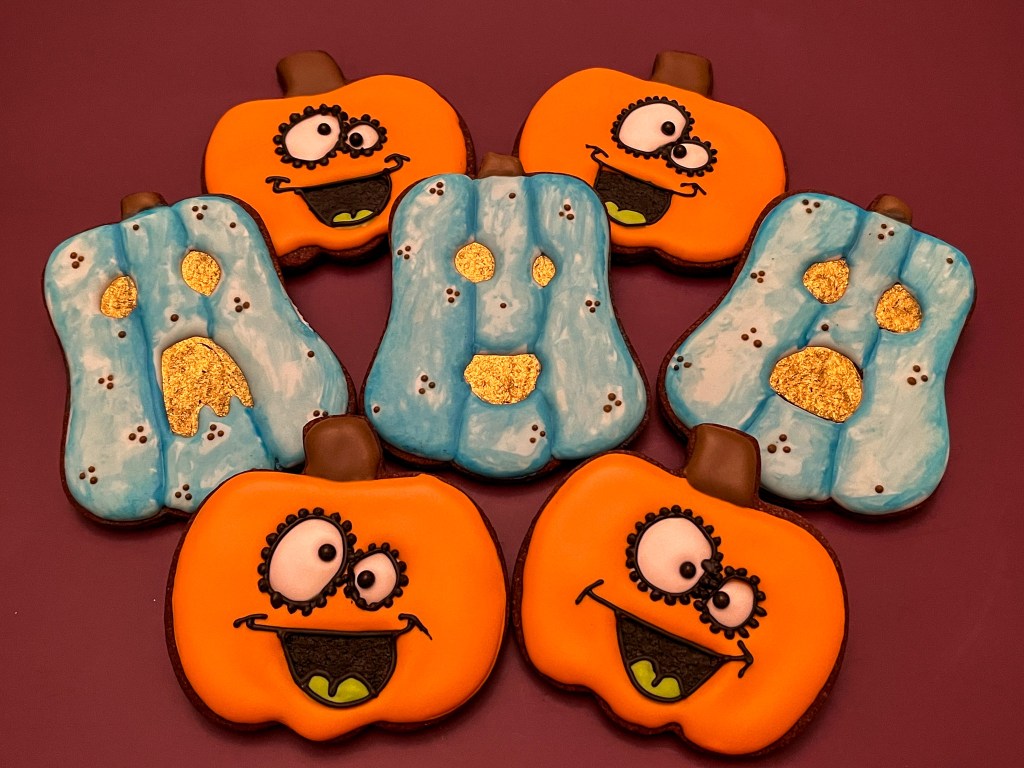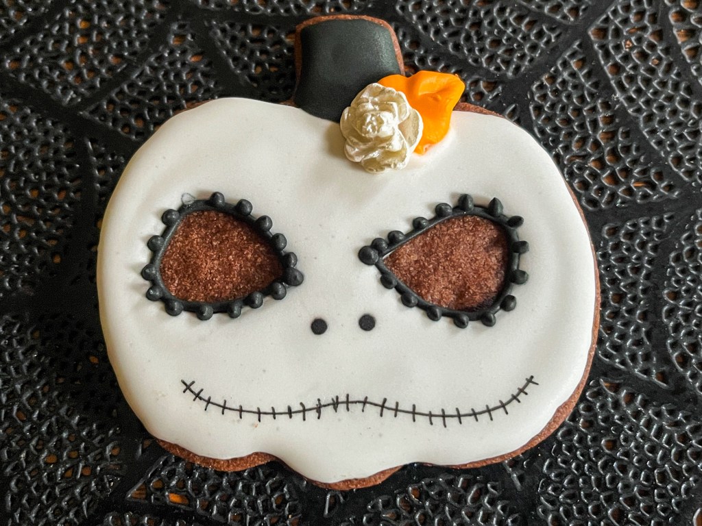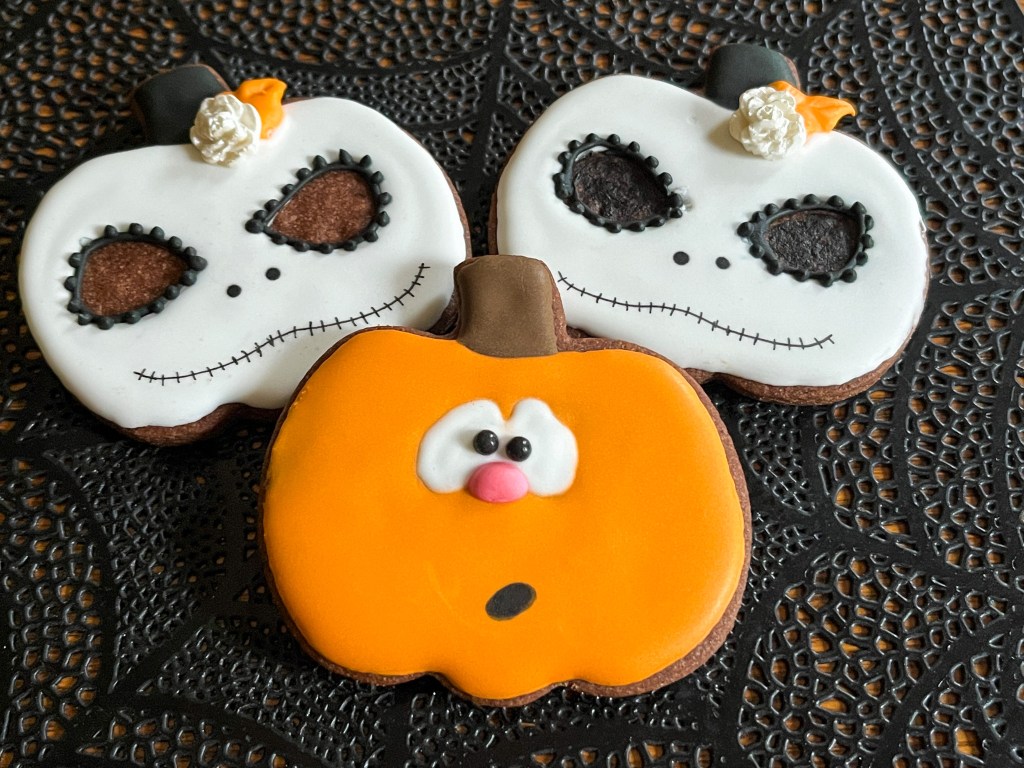 Those are also very simple, starting with sketching the eyes and either filling those with icing and covering with black sanding sugar, or flooding the full pumpkin and adding the eye region next.