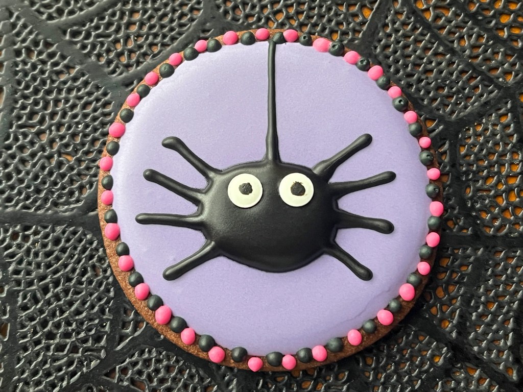 Flood the cookie with purple, allow that to set, then pipe a circle-oval for the body of the spider, add the eyes (in this case store-bought candy), the legs, the hanging web, and finally the border dots.
