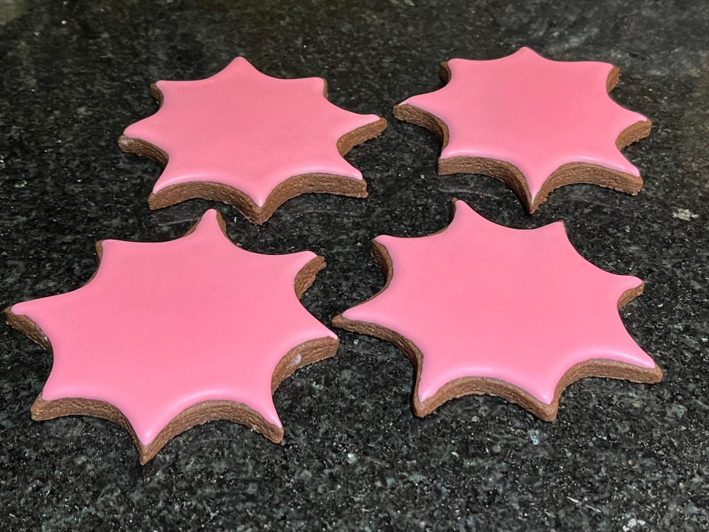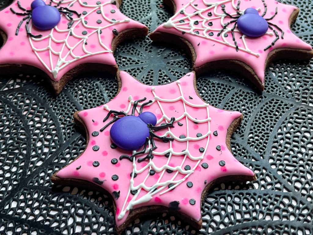 Aren’t these cookies absolutely adorable? How can spiders be adorable? I have no idea but Haniela managed to make them so. You can find her super detailed blog post about it with a click here. She used many colors, I simplified my life a bit and went with just pink. The cookies are not complicated to make, but to make them exactly as Haniela designed, you’ll need a stencil, air-brush, and piping fine lines. The spider body is best made as a Royal icing transfer the day before. I did not use a template, just eye-balled a body and small little head on top.