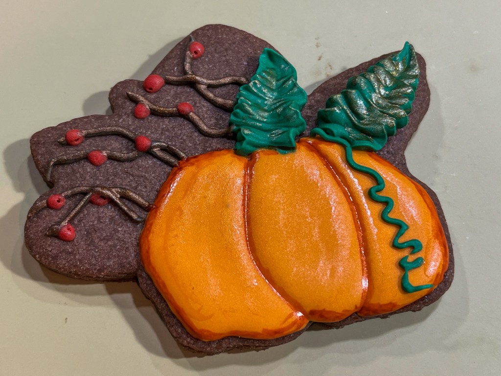 I decided to use some gel color to shade the pumpkin once the cookie was fully set, and also add some bling to the vines, branches and leaves.