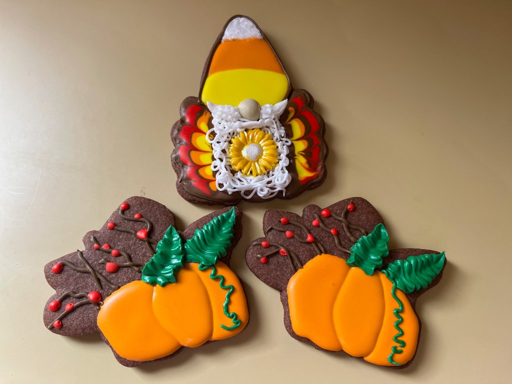The cookies were quite fast to decorate, Amy devised a way to work on both designs at the same time in a super efficient way, no need to even use a dehydrator. First we piped the two external sections of the pumpkin, moved to the gnome and went on a back and forth like that. Some steps shown below. The only components needed before actually decorating were the nose and the sunflower, both made with fondant.