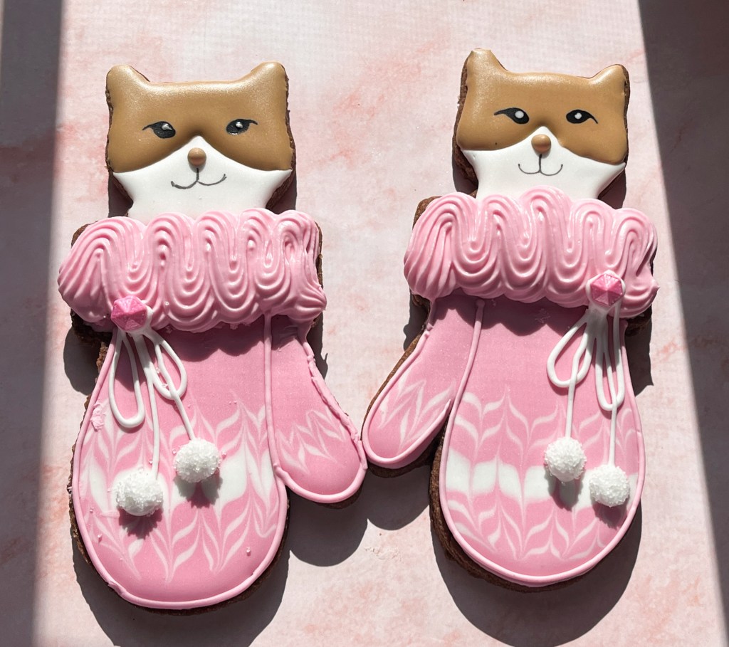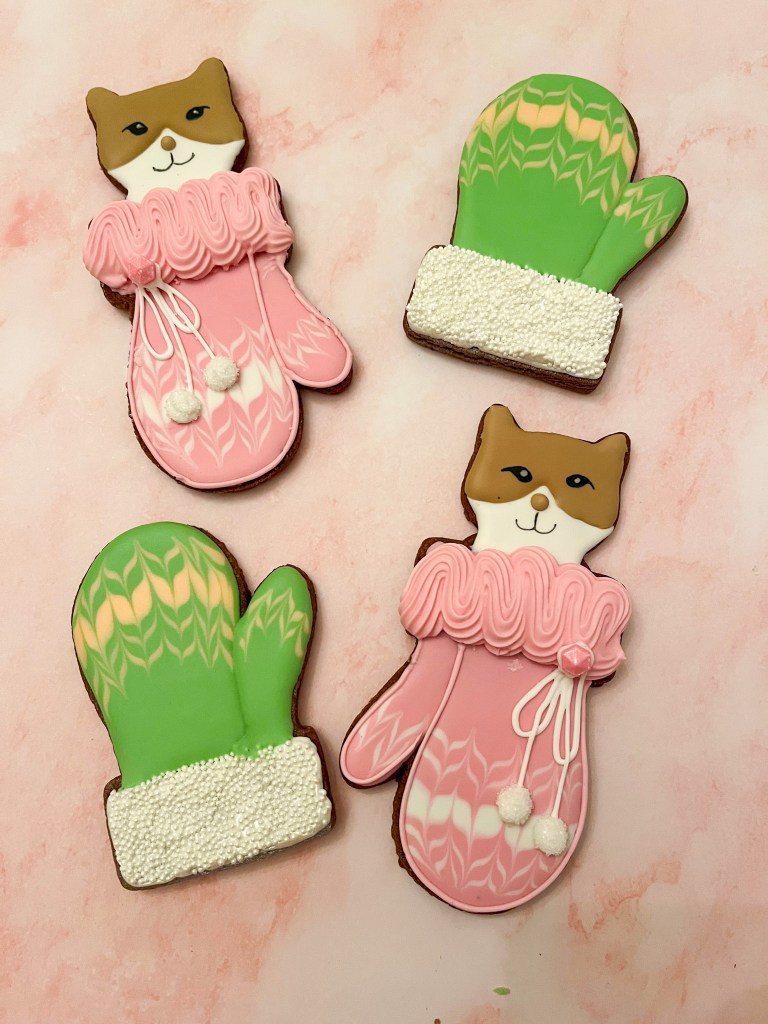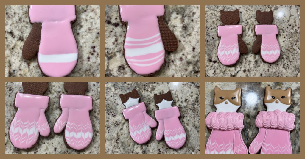 I confess it was a lot of fun to try and figure out the steps to make them and the pattern for the mittens. I slightly modified her version by omitting the little paws (full disclosure, I forgot to bake small circles for that purpose), and by increasing the size of the cat component, so that I could include the little mouth. Other than that, I think I followed it closely. This is an example of a Frankenstein cookie, in which two shapes are used to join two cookies together. Some of the steps are shown below…