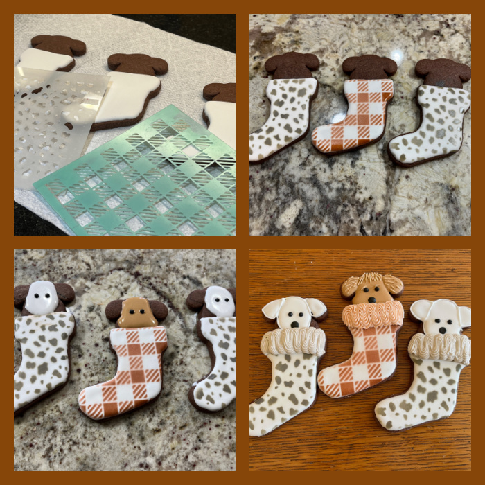 A departure on the recent Kitten in a Mitten design, this time I went with stockings to feature our three beloved pups, Prince, Oscar and Star. Some of the steps are shown below. Stencil and air-brushing was used for the background pattern.