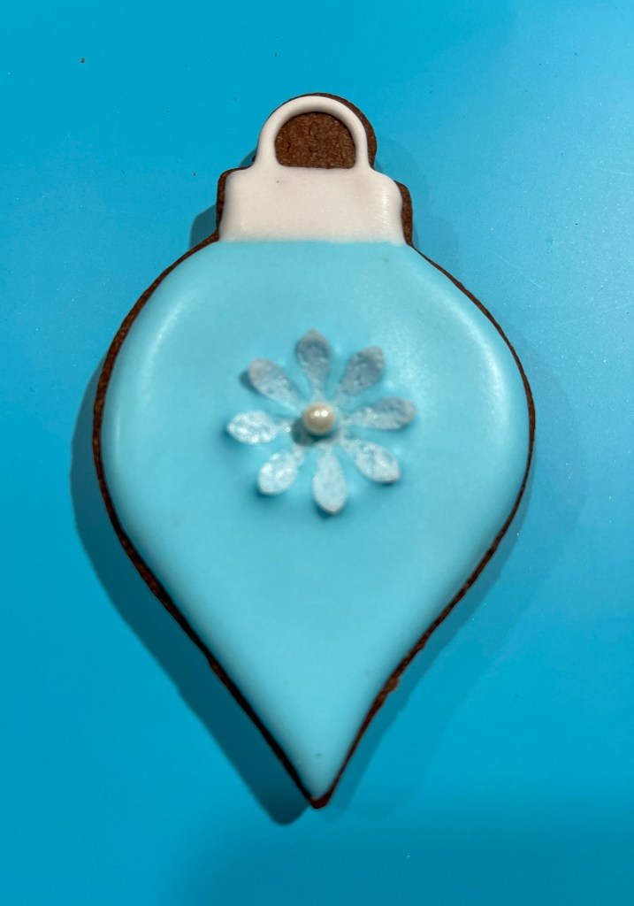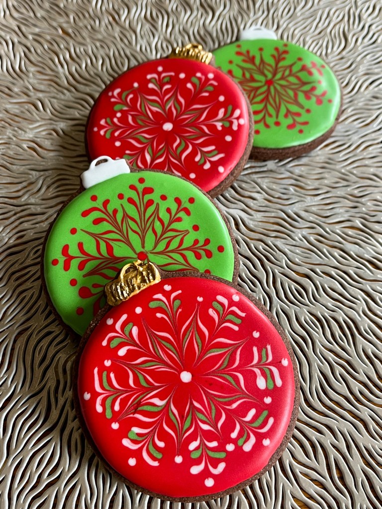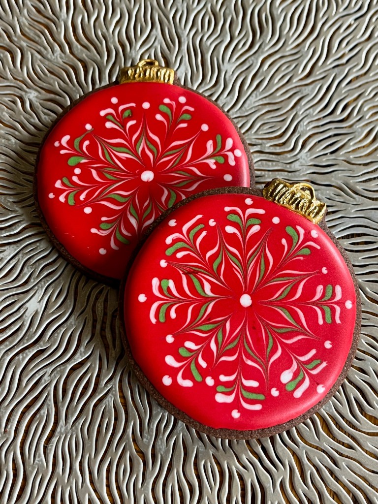 Today I share a collection of Christmas ornaments in cookie format, but I will start with a design I am beyond excited about! I was watching some reels on Instagram and some professional cookie artists shared cookies made by wet-on-wet but using a method I had never seen before. Just like dots are often used to form hearts pulling through the center with a needle, you can do a lot of interesting compositions pulling straight lines. And I confess, I am a little obsessed…. ( are you surprised?)