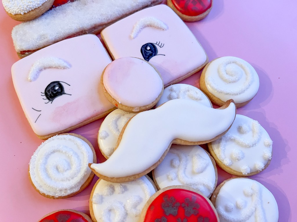 You will need this cookie cutter set, although you can always improvise with cutters you already own, you might just have what is needed. The tricky component would be Santa’s hat, but you can always cut it by hand using a template. All red cookies were made with a stencil and air-brushing. The round circles for the beard were simply iced and then the decorative swirls sprinkled with sanding sugar.