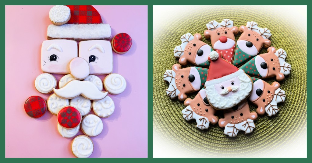 Two fun ideas to perk up your Cookie Holiday Season… A super modern take on Santa Claus, and a cute cookie composition of 8 reindeers circling Santa.