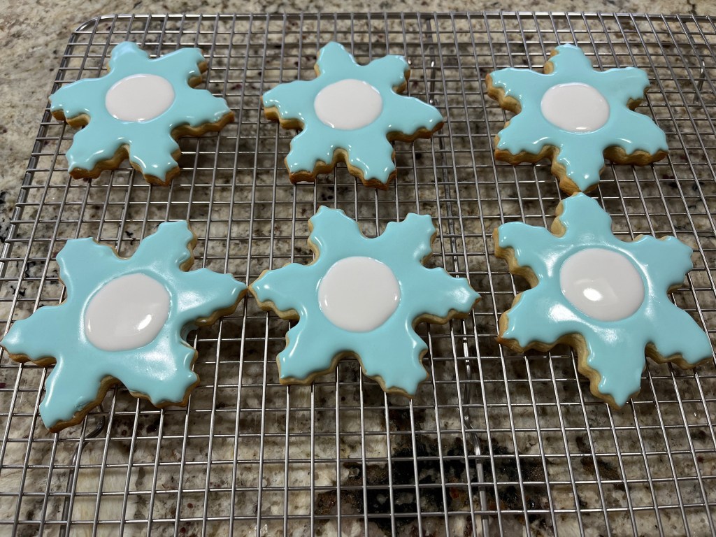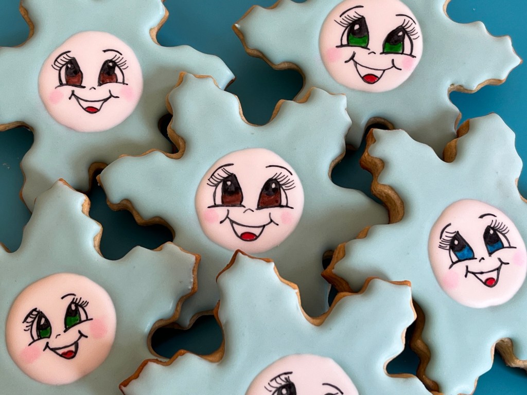 Start by flooding the snowflake shape with a very light blue color, leaving an empty circle in the center for the face…