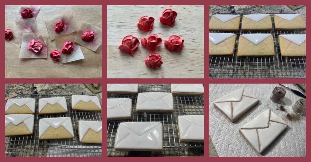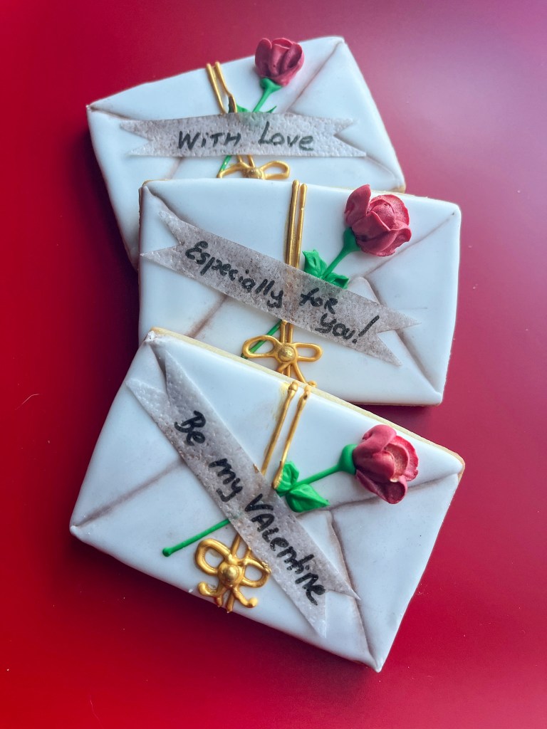 Of course, I cannot divulge the details as they are part of Haniela’s tutorials on Patreon, but you will need to pipe some flowers using a petal tip and stiff consistency icing, then add some bling by dusting them with luster powder. Same basic technique applies to the envelope component to give it an “aged” look. Haniela’s video will show you every single step in great detail, as usual.