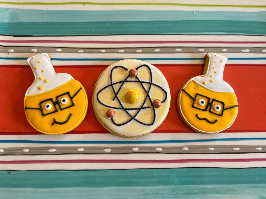 This was such a fun project to design and bring to cookie life! My friend’s son turned three years old and he loves all things science, so I went to work… Let’s just not talk too much about the fact that I thought he was turning 4, and well…. I messed up one of the designs for that reason. What can I say apart from “I am so sorry!”