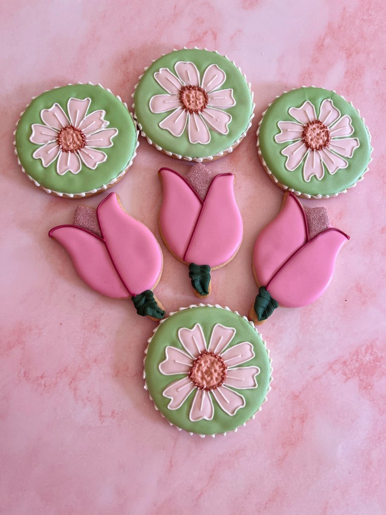 Going a little modern, the cookie is flooded in white and two tones of green. Once that fully sets, fine lines add the design. A border of white sanding sugar and a spray with PME pearl luster, that’s all you need!