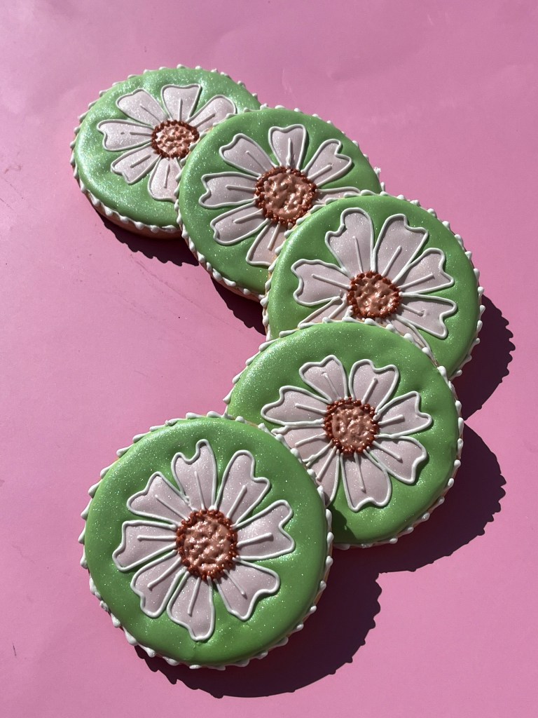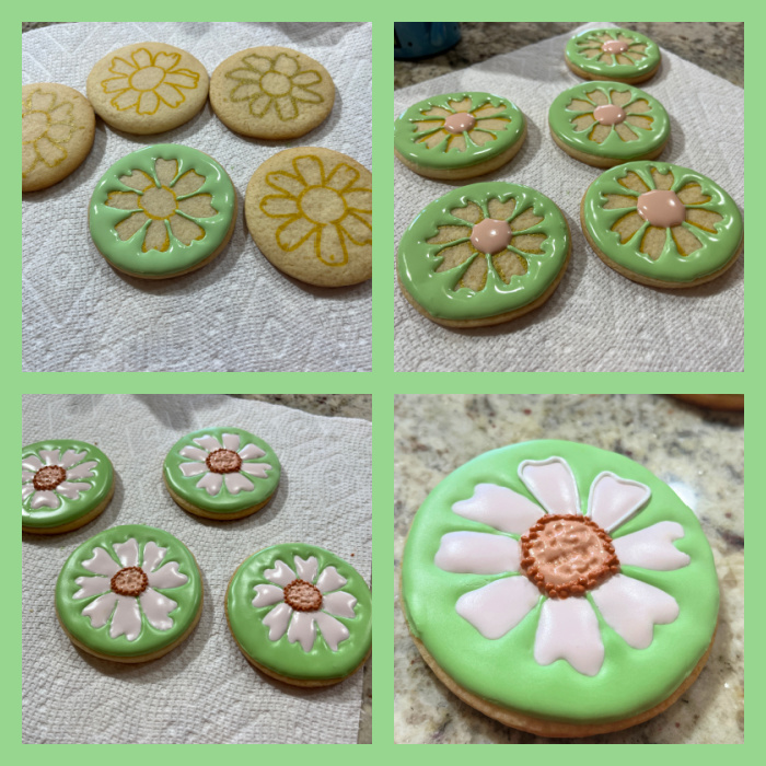 Also quite straightforward, I did not even used a template for the petals, just drew 8 petals all around the center. Flood the green part, wait 10 minutes, flood the white. Then add the center and some texture with the handle of a brush once the icing is starting to set. Fine lines accentuate the petals, little dots surround the center, and a little bead border gives a nice touch. I finished the cookie with a light spray of PME pearl luster. Some steps shown below…