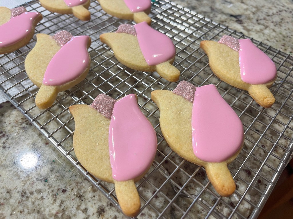 This is a very simple cookie to decorate… Flood the center and immediately add sanding sugar (I used pink shimmery sugar). Then flood the two other sections, one at a time, waiting about 10 minutes for the first section to set a bit, so you get a good separation between the two halves. Once that is set, add a fine line and the stem.