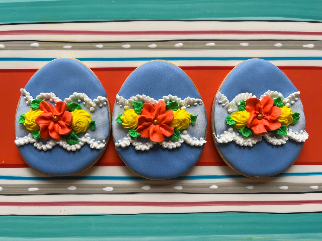 The flowers are all piped with thick consistency icing, using a star and a petal tip. For the leaves, use a small leaf icing tip. You can change the colors of the flowers or the background, and of course, once Easter is over, you can use a frame shape to create a similar design. Super stylish and elegant, I think…